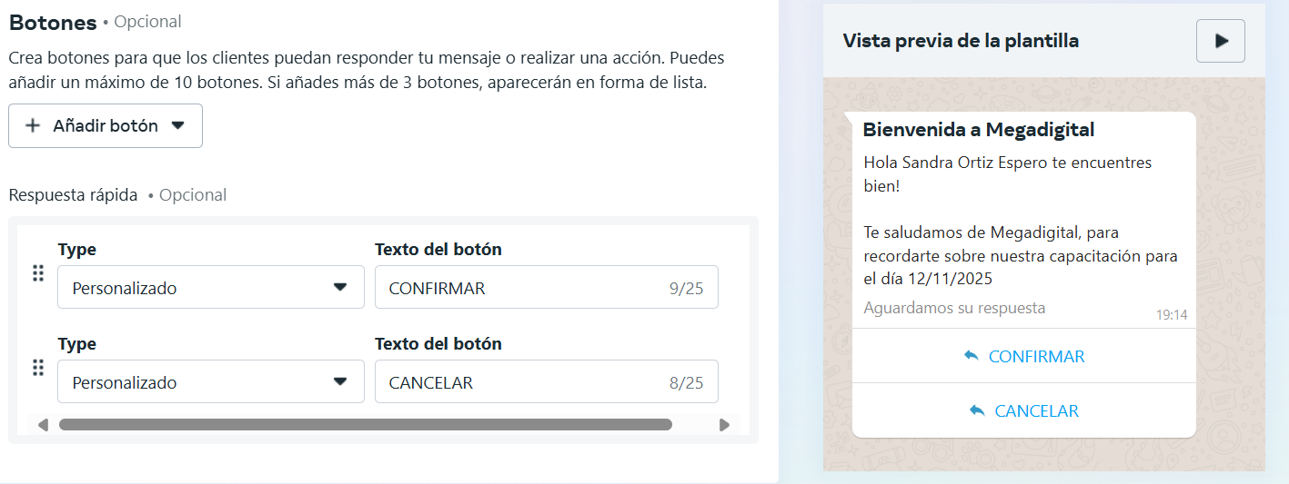 Agrega botones interactivos para facilitar la respuesta del cliente.