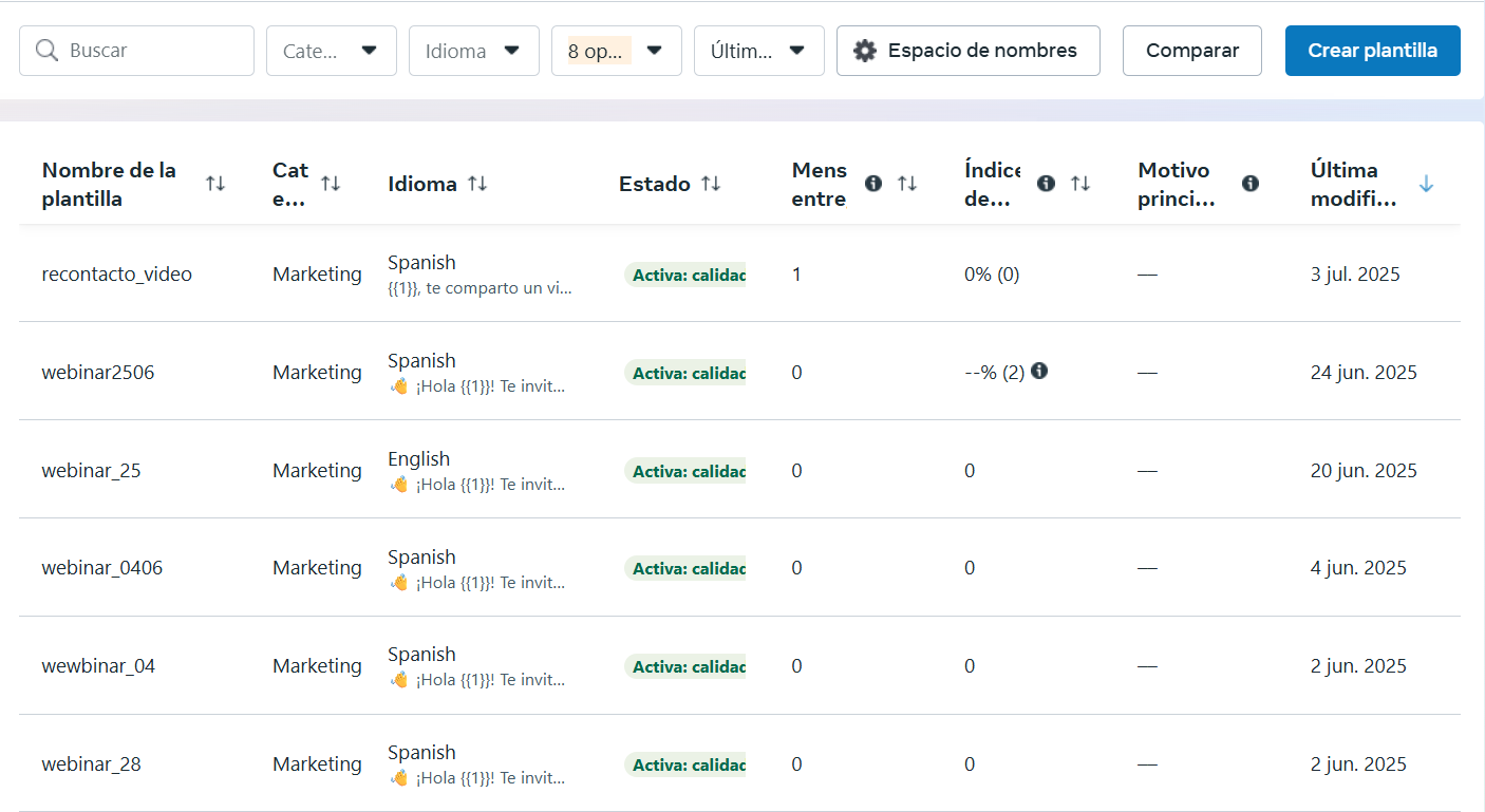 💡 Importante: Aquí encontrarás todas las plantillas que has creado anteriormente, podrás editarlas, eliminarlas o crear nuevas.
