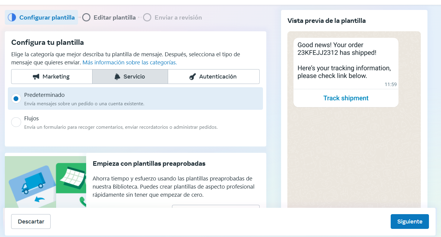 🔍 ¿Por qué "Servicio"? Esta categoría es ideal para comunicaciones relacionadas con actualizaciones de pedidos, confirmaciones, recordatorios y atención al cliente.