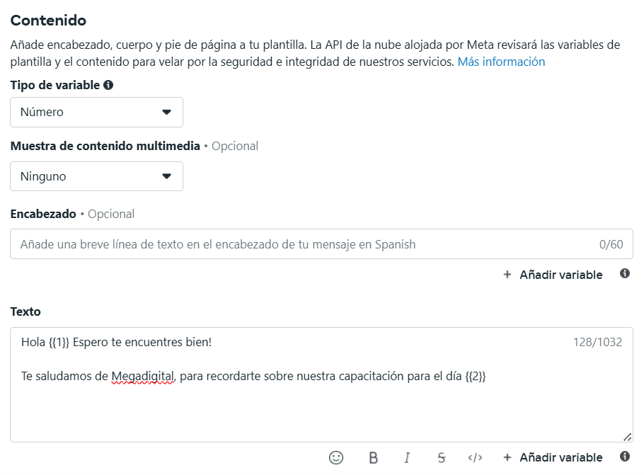 Ejemplo: {{1}} se reemplaza por el nombre del cliente en cada envío.